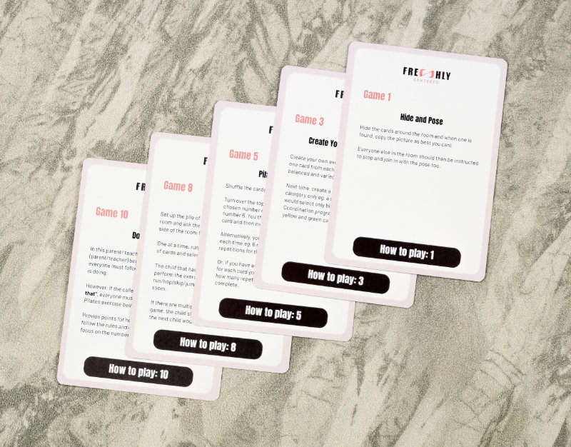 Tracy created the Freshly Centered Pilates for Kids cards to share her love of movement with little ones. She is passionate about helping children move safely, grow stronger, and discover how much fun exercise can be! These cards are also designed to encourage calmness, focus, and emotional regulation—helping children feel balanced in both body and mind.
